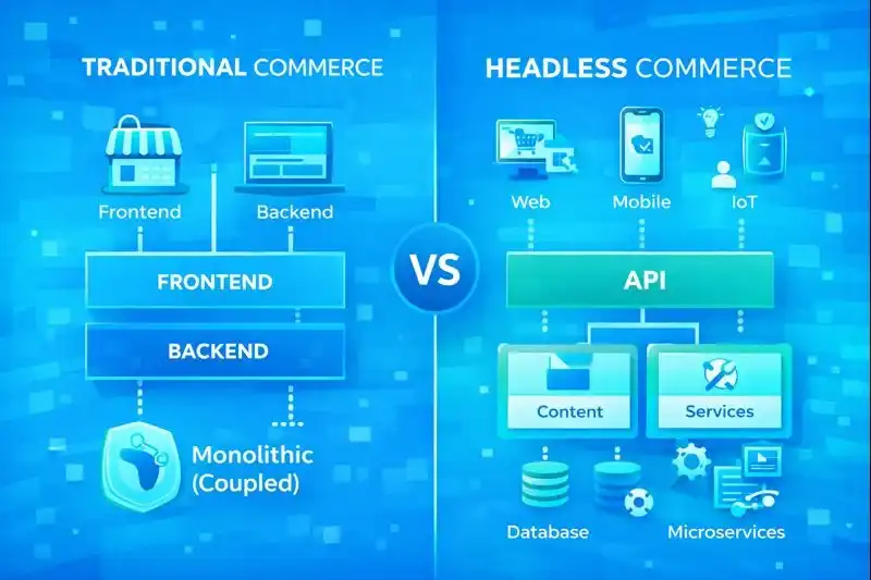Platforms like traditional Shopify, Magento, WooCommerce tightly couple front-end and back-end. Advantages: Simpler setup (everything integrated), lower initial cost ($29-$299/month), extensive plugins (app ecosystems), no developers required for basic stores.