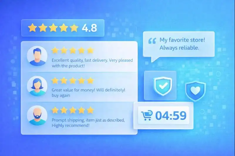 Active collection: email 7-14 days after delivery asking for a review. Offer a bonus (5-10% discount on next purchase). Display: star rating near title, filtering capability, customer photos, responses to negative reviews. Don't delete negative reviews — products with 4.2-4.7 ratings sell better than perfect 5.0. Mark "Verified Purchase" for trust.