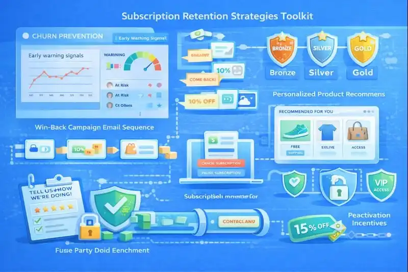 Multi-layered churn reduction strategy addresses voluntary and involuntary attrition. Combat involuntary churn (40% of total): Dunning management - automatically retry failed payments 3-4 times over 7-14 days with customer email reminders. Recovers 30-50% of failed payments. Payment method diversification - enable multiple backup payment methods reducing single-card failure impact. Pre-billing verification - validate card works 3 days before billing allowing customer updates. Reduce voluntary churn (60% of total): Exceptional onboarding - first 30 days determine long-term retention. Welcome series, usage guides, satisfaction check-ins. Flexible management - enable skip, pause, frequency adjustments preventing "too much product" cancellations. Proactive intervention - identify at-risk subscribers (skip patterns, support contacts) and offer retention incentives before they cancel. Continuous value delivery - regular communication highlighting savings, exclusive benefits, new products. Win-back campaigns - for churned subscribers, 30-60 day win-back offers (25% discount to return) recover 10-15% of cancellations. Benchmark: 5% monthly churn reduction = 20-30% LTV improvement.